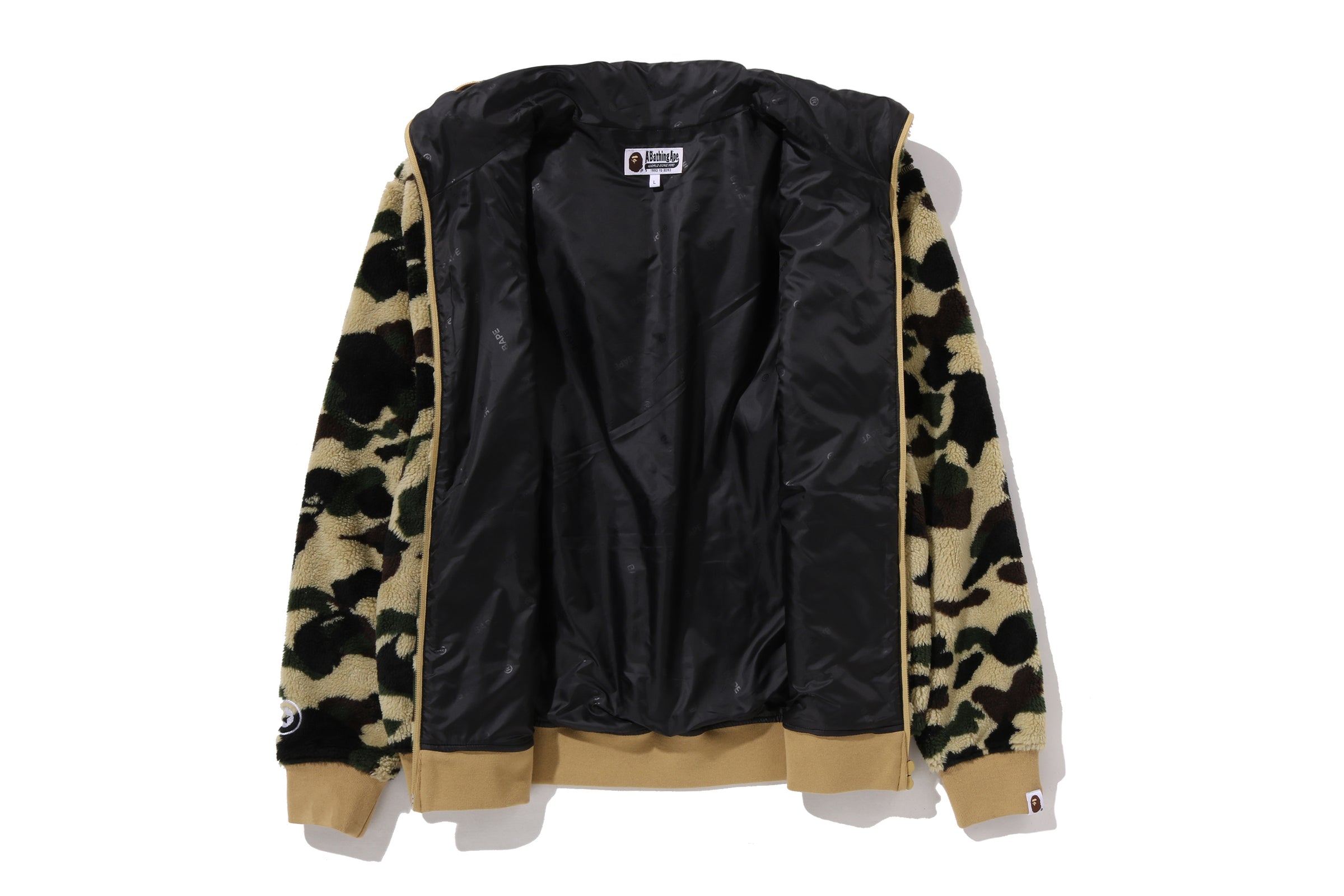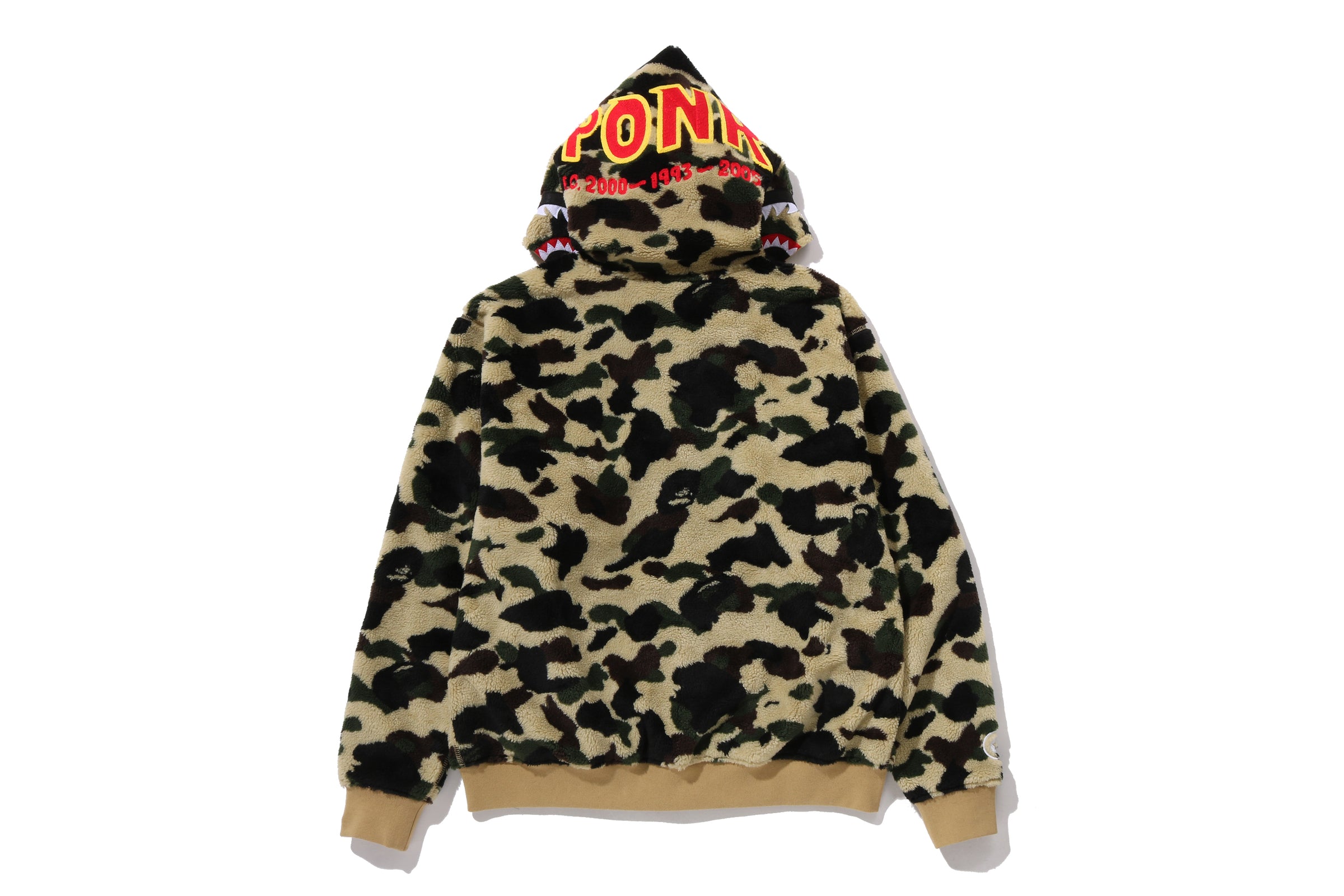 Layer up with this iconic hybrid hoodie jacket that merges BAPE's signature camo aesthetic with a bold shark design. The plush boa delivers premium comfort and warmth, while the structured silhouette keeps you looking sharp. Perfect for making a statement whether you're heading out or settling in, this piece combines streetwear edge with cozy functionality.